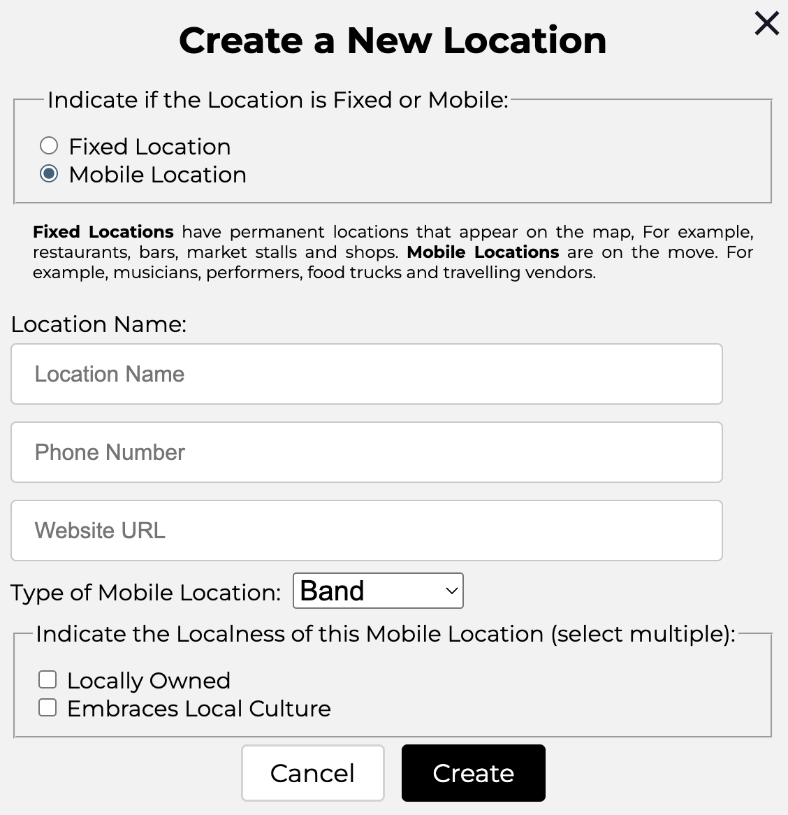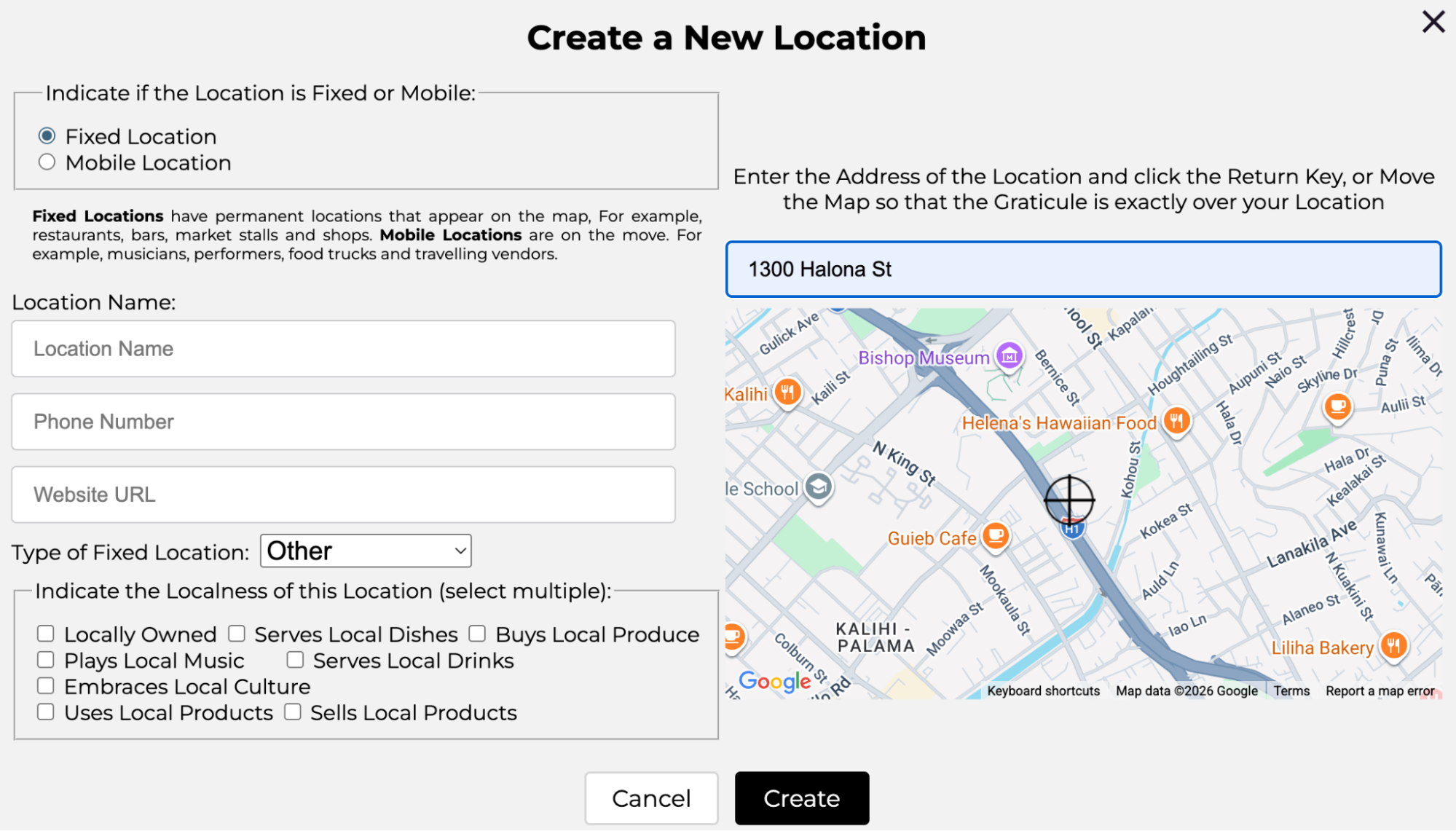 This dialog includes a Map as the location is fixed. You may enter an address in the entry field or leave it blank and move the map. In this case the address is’ 1300 Halona St, Honolulu’. Most locations are fixed (for example shops and restaurants) but the vendor may select ‘Mobile Location’, top left.