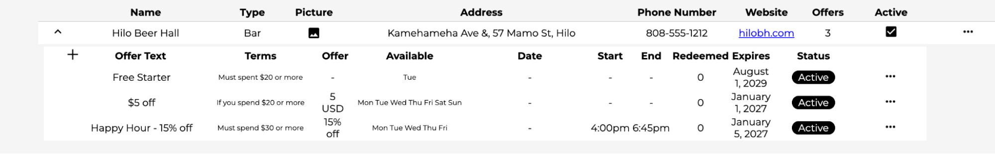 In summary, you need to sign up and then create a fixed location or mobile business (also called a ‘location’) and associate one or more offers with it. This gets you started. Active offers and locations look like this on ezecache.com: