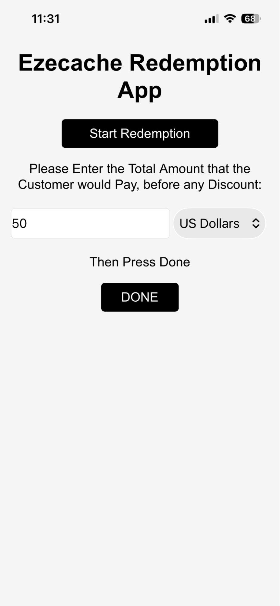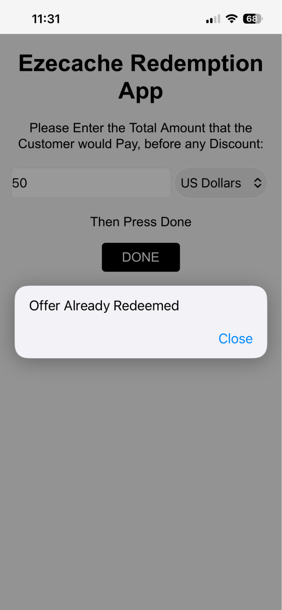 This site asks various questions, such as the amount the user paid and, assuming all is well, the offer is redeemed and the user's account (total savings) and the vendor’s dashboard is updated. When the amount has been entered, click ‘DONE’. This completes the process. An offer can only be redeemed once, or an error is generated.
