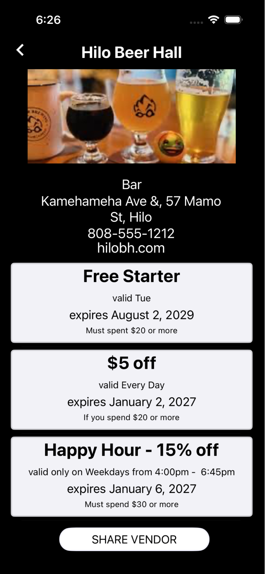 Locations don’t appear in the app unless they are ‘Active’ (see above). Above is an example of how active vendor locations may appear on users’ phones.