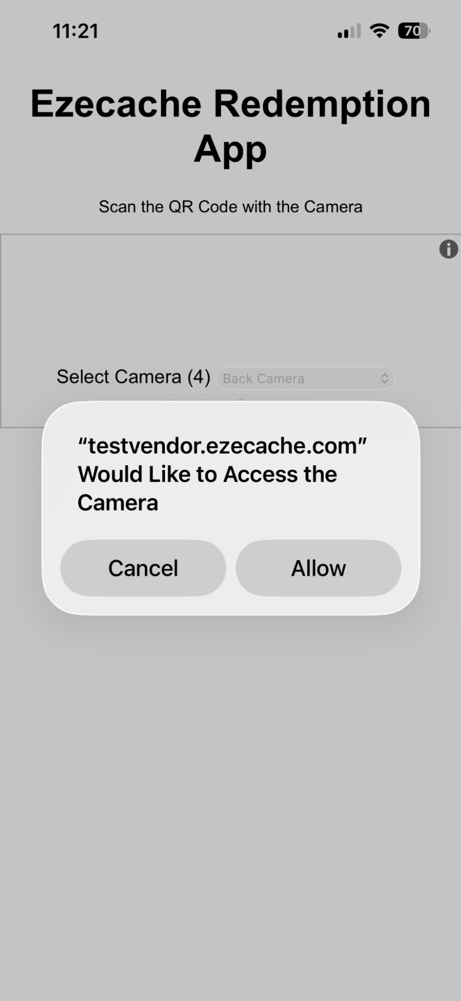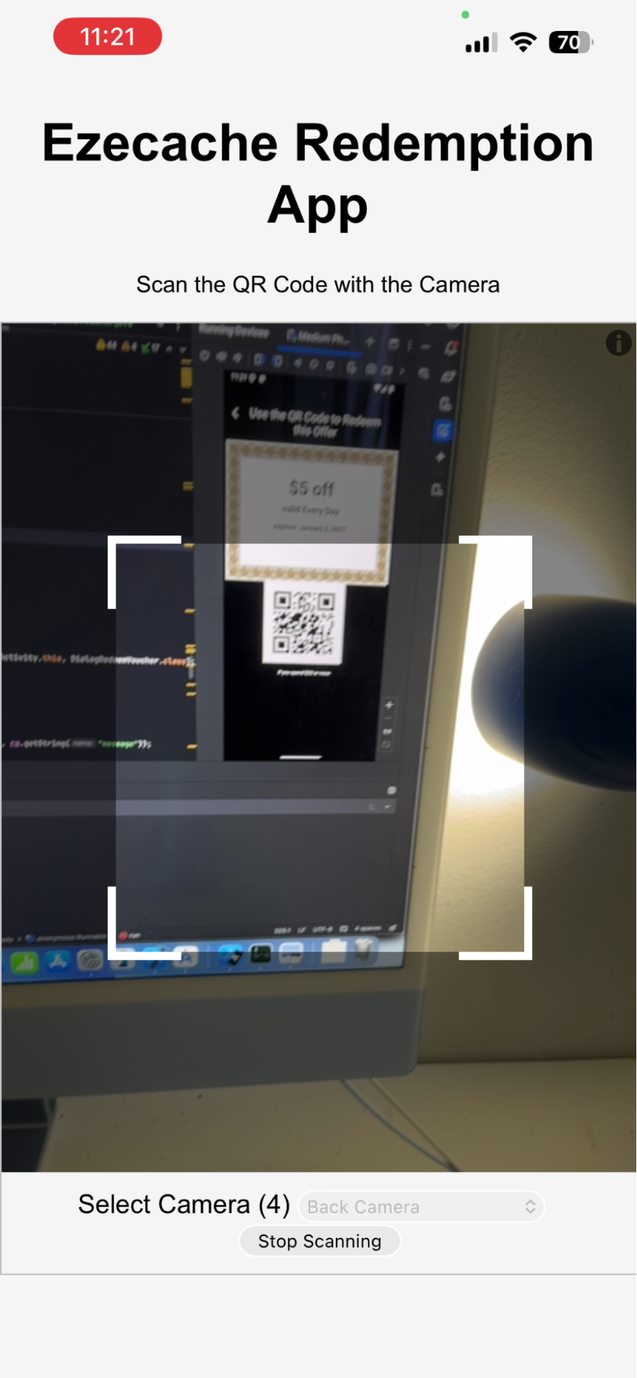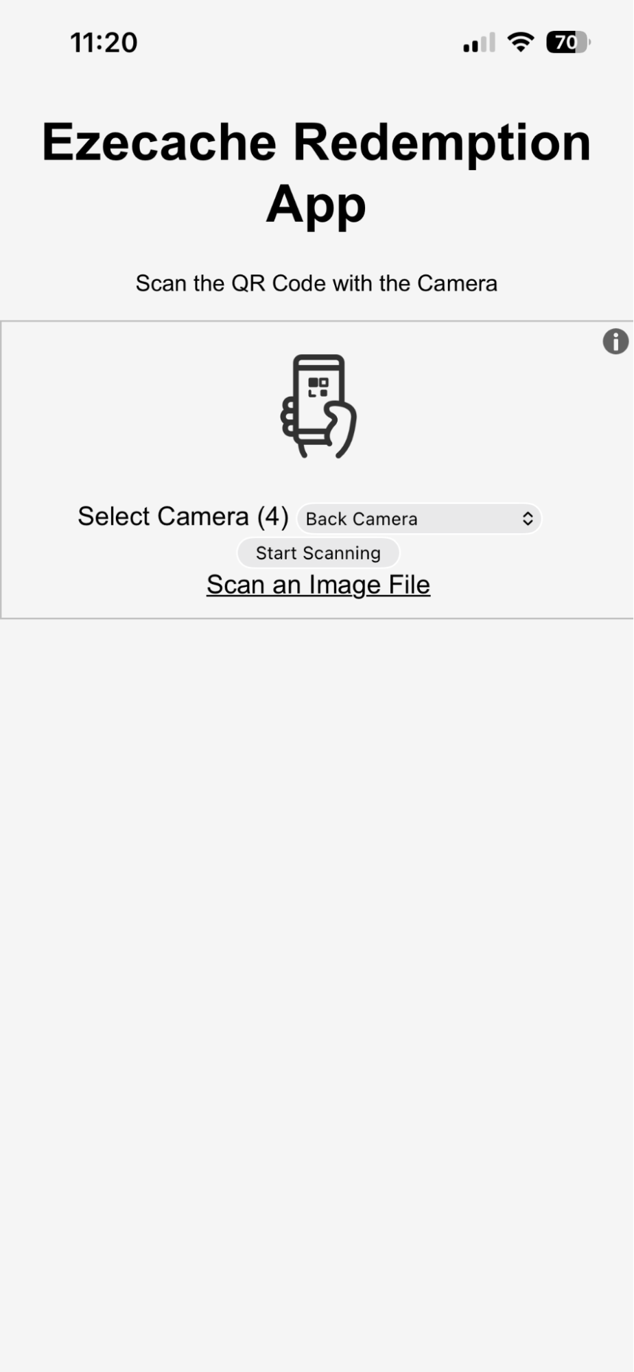 Click ‘Start Redemption’ to get started. The camera will appear. If necessary choose the camera (back or front) and allow the app to use the camera. Then click ‘Start Scanning’: