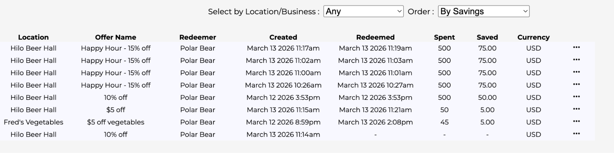 The ‘dashboard’ is reached using the ‘Dashboard’ tab. It displays, in realtime, what is going on with your offers. Using the dashboard you can see which offers are popular at which locations or businesses. You can search for offers based on business or location. Most importantly you can get counts and totals which allow you to optimize your offers and business. For example you might find that offers can turn a slow night into a winner.