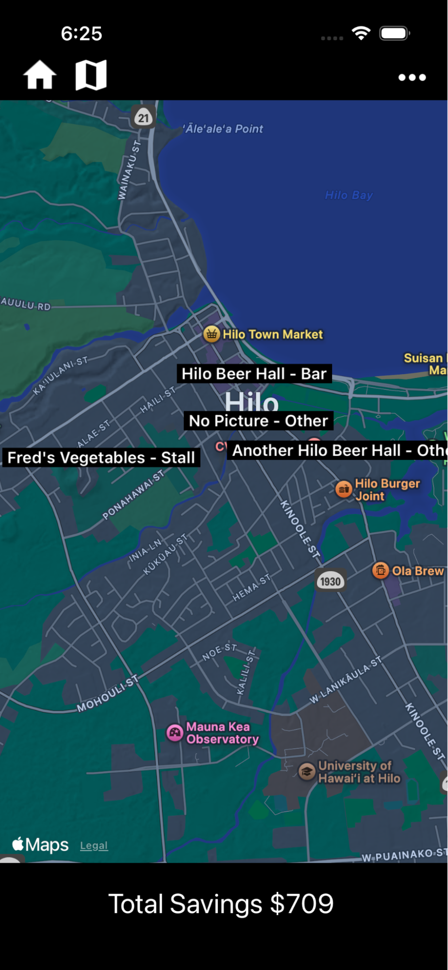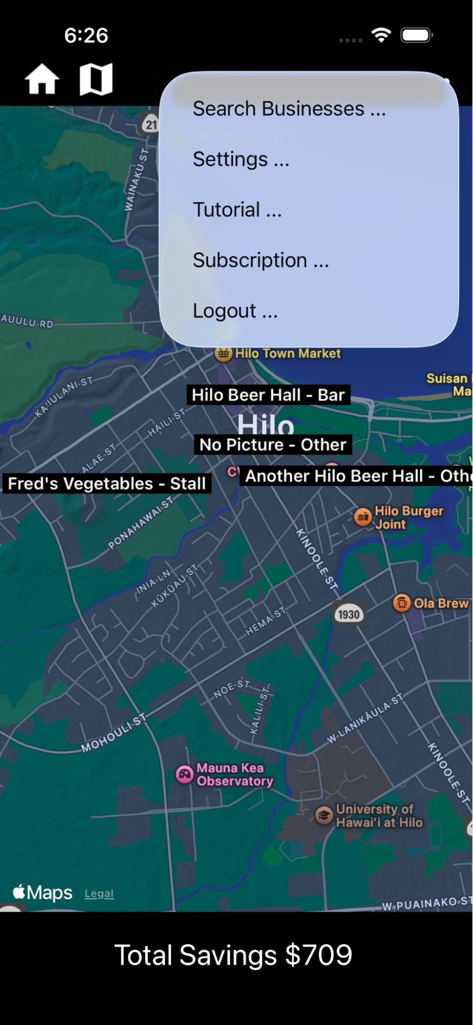 Users use our App on their phone, either iPhone or Android. Here’s what it looks like on the iPhone. Android is much the same. Note the vendor locations on the map: