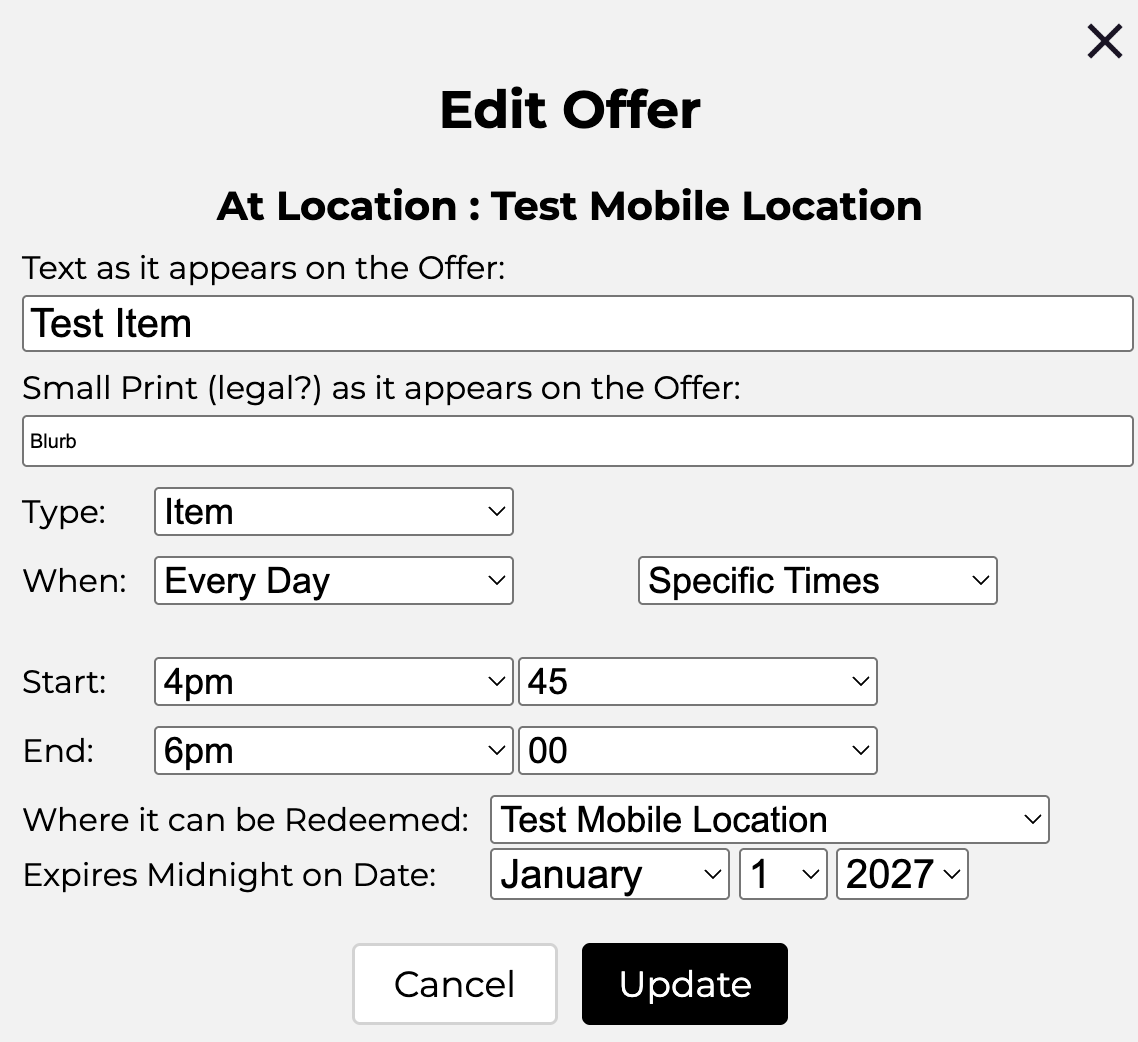 To edit an existing offer select ‘Edit this Offer’ from the offer’s menu. This will cause a dialog to appear populated with the existing offer’s data. For example: