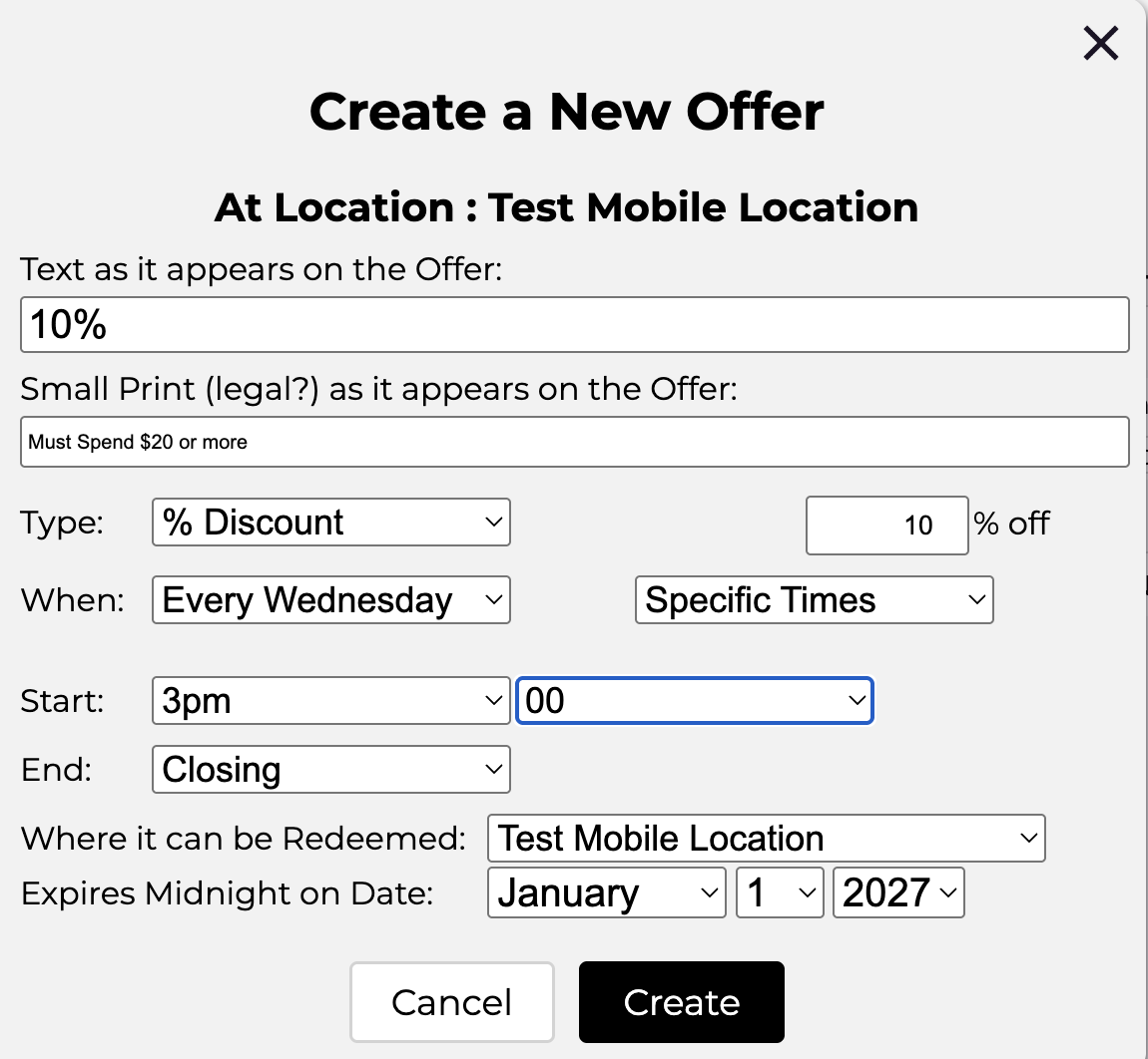 Let us say that you want to offer 10% off to customers who spend $20 or more on Wednesdays between 3pm and closing (at 7pm). This is easily done via the ‘Create Offer’ dialog. First Bud opens his location by clicking on the icon. Then he clicks and the ‘Create Offer’ Dialog Appears. Choose the correct parameters for his offer, thus: