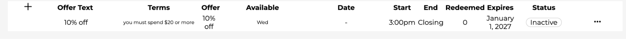 Status indicates whether the offer appears on users’ phones. It is either ‘Active’ or ‘Inactive’. Unless an offer is ‘Active’ it does not appear in the Ezecache App. Click on the button to change the offer’s status. This allows you to play with offers before they appear at a location.